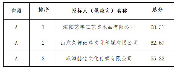 本项目(包段)按照综合评分法评审,排序第一的报价供应商为本项目的成交供应商,其余报价供应商均为未成交供应商。各报价供应商未成交的原因为:山东久舞致尊文化传媒有限公司、威海赫铭文化传媒有限公司评审得分较低。