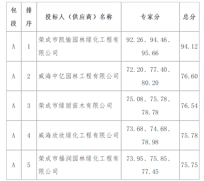 本项目(包段)按照综合评分法评审,排序第一的报价供应商为本项目的成交供应商,其余报价供应商均为未成交供应商。各报价供应商未成交的原因为:威海中亿园林工程有限公司公司、荣成市绿丽苗木有限公司、威海欣欣绿化工程有限公司、荣成市福润园林绿化工程有限公司评审得分较低(绿化提升设计方案评审因素不占优势)