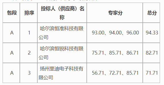 本项目(包段)按照综合评分法评审,排序第一的报价供应商为本项目的成交供应商,其余报价供应商均为未成交供应商。各报价供应商未成交的原因为:哈尔滨恒锐科技有限公司评审得分较低(产品选用评审点、系统设计方案评审点、项目实施方案评审点、售后服务方案评审点等评审因素不占优势)扬州里迪电子科技有限公司评审得分较低(产品选用评审点、系统设计方案评审点、项目实施方案评审点、售后服务方案评审点等评审因素不占优势)
