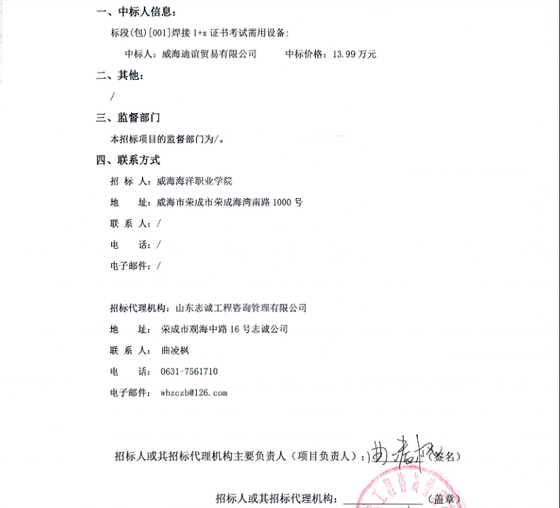 威海海洋职业学院焊接1+x证书考试需用设备成交公告