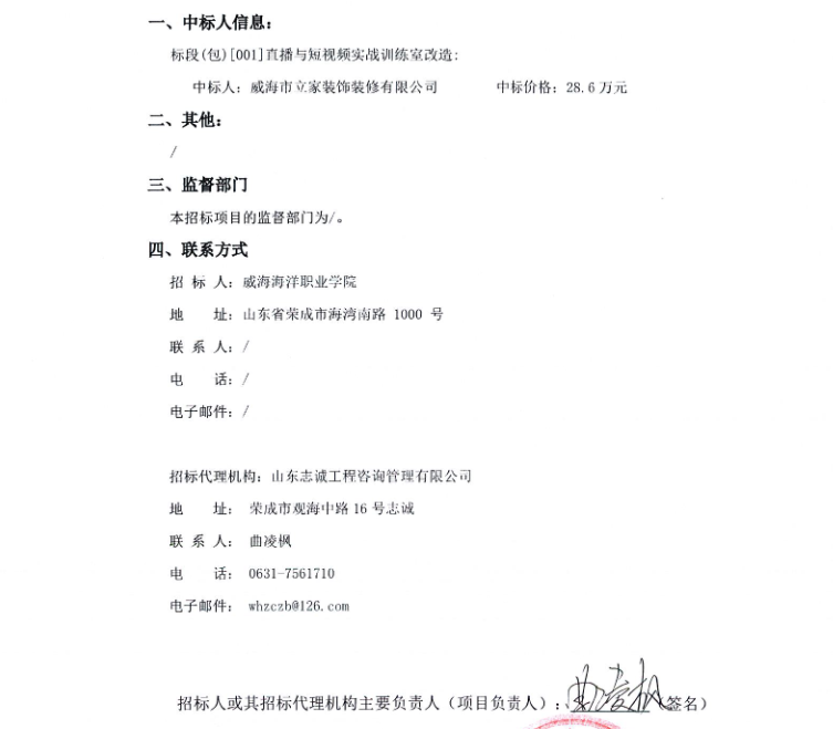 威海海洋职业学院直播与短视频实战训练室改造项目成交公告