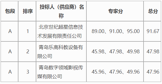 本项目(包段)按照综合评分法评审,排序第一的报价供应商北京世纪超星信息技术发展有限责任公司为本项目的成交供应商,其余报价供应商均为未成交供应商。各报价供应商未成交的原因为:青岛乐高科教设备有限公司评审得分较低(现场演示评审点、同类业绩评审点、企业实力评审点等评审因素不占优势)青岛数字领域影视传媒有限公司评审得分较低(现场演示评审点、同类业绩评审点、企业实力评审点等评审因素不占优势)
