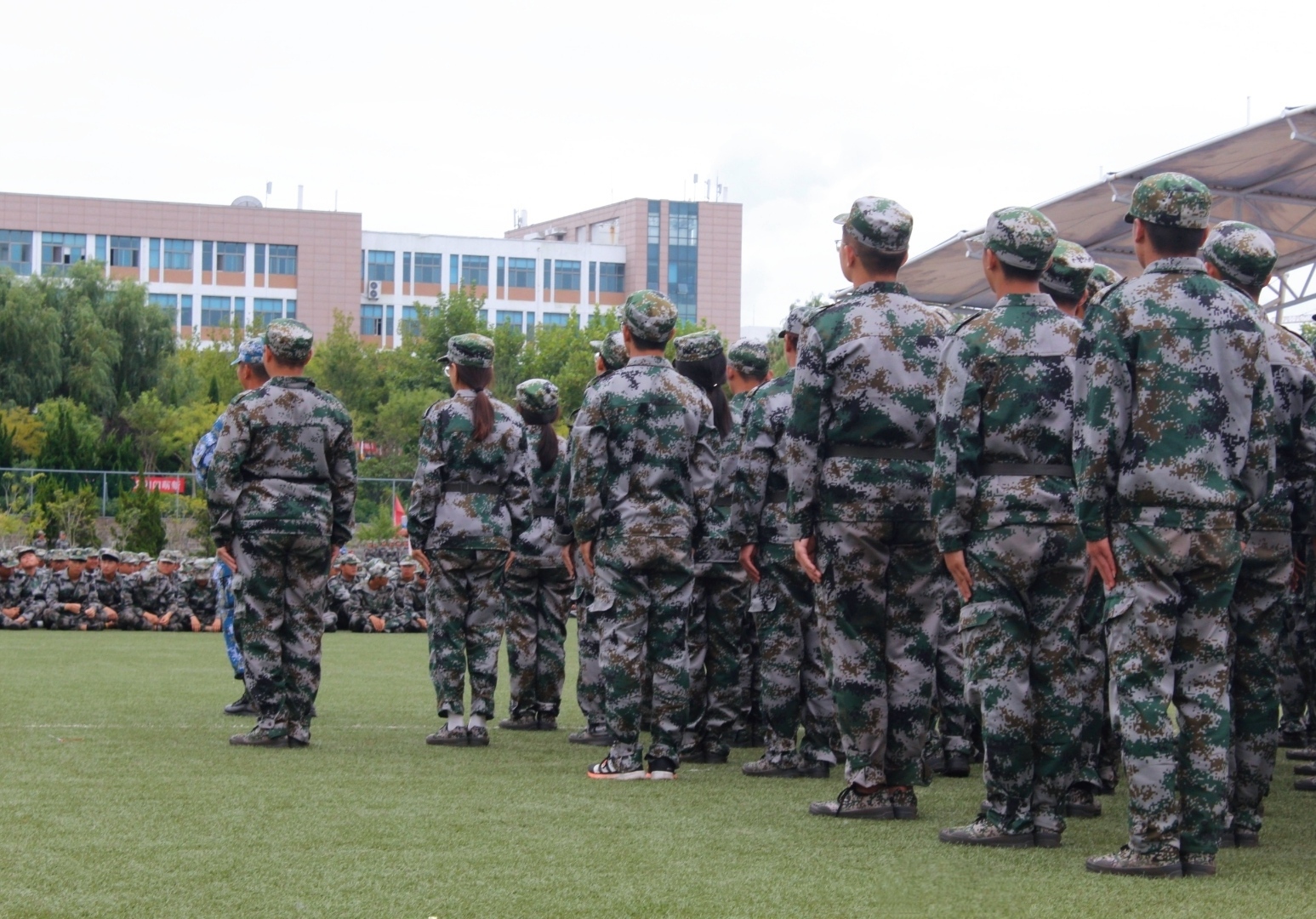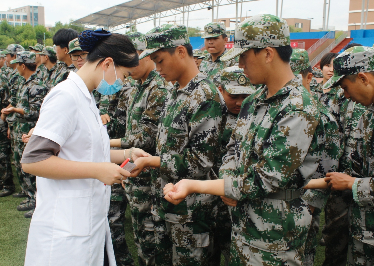 休息时刻,医务人员来检查机电学子们在接种新冠疫苗后有无特殊情况的发生,在教官的指导下,21级学子们分为5排三列,积极配合着医务人员的检查。