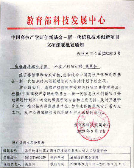 近日我系燕居怀教授主持的《基于边缘计算的海洋环境适应型无人机人工智能平台》项目顺利通过答辩,获得教育部科技发展中心中国高校产学研创新基金专项资金支持。