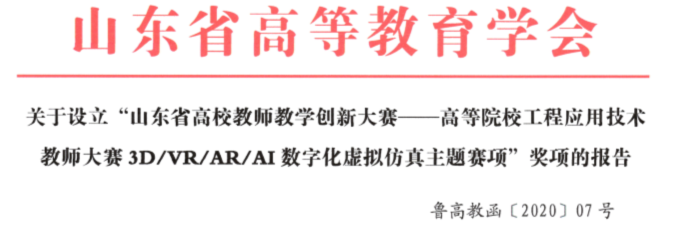2020年10月,由山东省高等教育学会主办的“山东省高校教师教学创新大赛—3D/VR/AR数字化虚拟仿真主题赛项”总决赛圆满落下帷幕。经过初赛选拔和复赛选拔,我省共有26支教师团队入围山东赛区总决赛,最终经专家评审、专委会审定我院教师两项作品获奖,分获一等奖和三等奖。