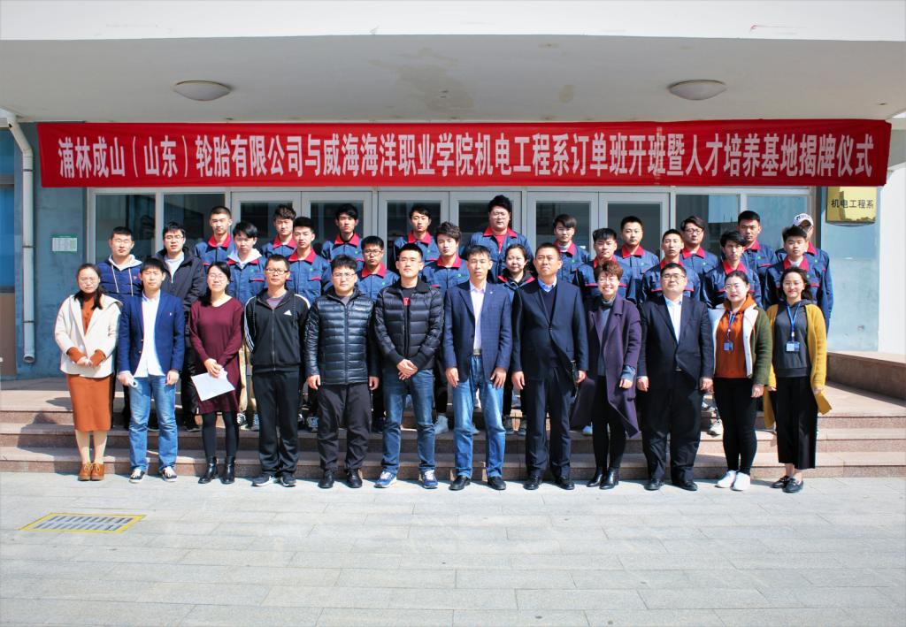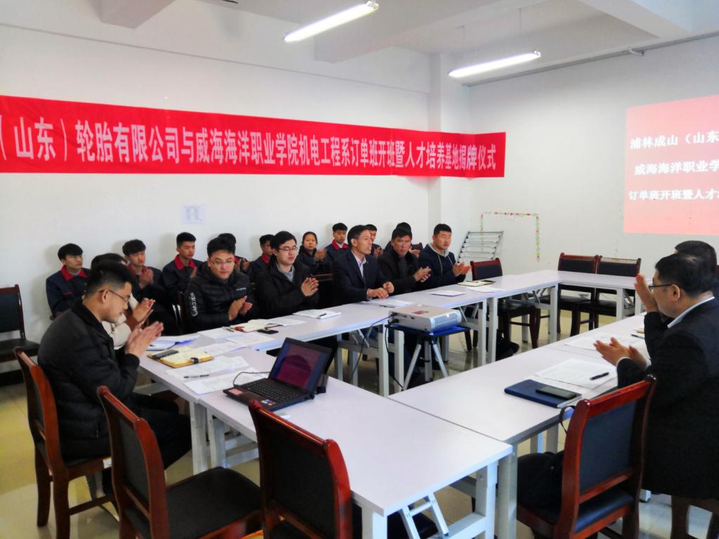 我系成山订单班开班仪式在明润楼210举行。浦林成山(山东)轮胎有限公司人力资源中心总经理刘维才先生、人力资源服务部经理 原怡女士、人力资源服务部招聘配置经理李怀校先生、机电工程系主任燕居怀教授出席会议并讲话,机电系部分老师和订单班的同学参加了开班仪式。开班仪式由蔡喜光老师主持。