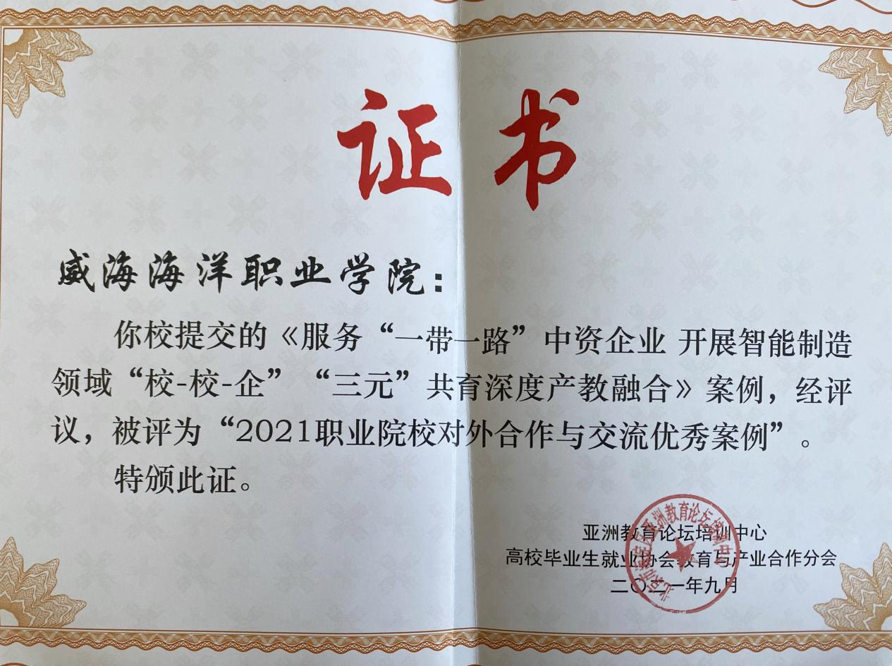 为增进中外职业教育交流,贯彻落实教育部等部门《关于加快和扩大新时代教育对外开放的意见》的有关精神,加强职业教育对外合作与交流,服务“一带一路”建设,亚洲教育论坛组织开展了“2021职业院校对外合作与交流优秀案例”的征集活动。我校机电工程系高翔老师撰写的《服务“一带一路”中资企业 开展智能制造领域“校-校-企”“三元”共育深度产教融合》一文被评为“2021职业院校对外合作与交流优秀案例”。