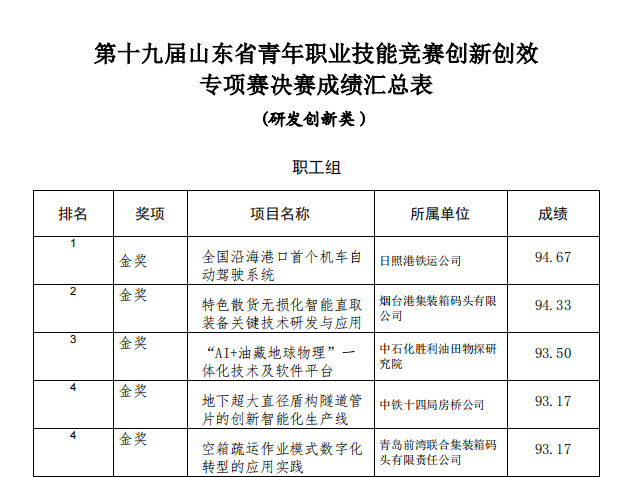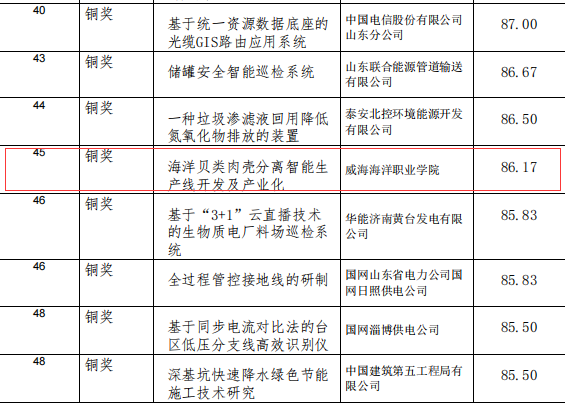 8月18日,由共青团山东省委、山东省人力资源和社会保障厅主办,山东省港口集团有限公司团委承办的第十九届山东省青年职业技能竞赛创新创效专项赛决赛在青岛港举行。机电工程系选送的项目《海洋贝类肉壳分离智能生产线开发及产业化》参加研发创新类职工组比赛斩获铜奖。