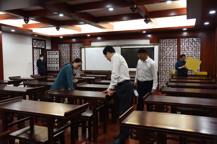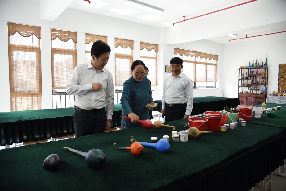 邵局长先后参观了位于明德学院四楼和三楼的传统文化核心教学场馆与非遗海洋特色文化教学场馆,在负责人的详尽介绍下,对明德学院的传统文化筑基、工匠精神养成、职业教育深化等教育理念进行了深入了解。随后对书法、绘画、彩绘葫芦、篆刻、剪纸等学生课堂作业进行观摩。