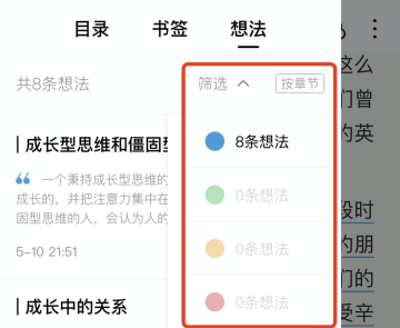 笔记定位:做了笔记想法需要时常回看复习,轻点屏幕中央唤出功能区,点击左下角目录,选择【想法】可查看该本书所有笔记,同时可以根据颜色分类选择想法。点击想法内容可直接跳转到原文相应位置。