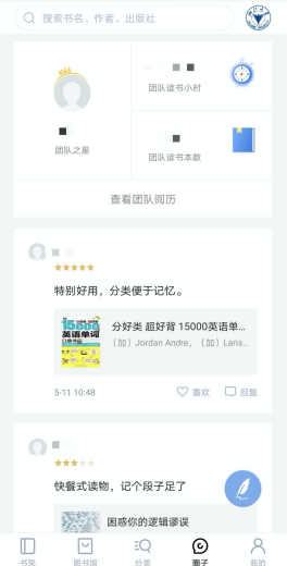 阅读界面可以就一本书、一页、或者一句话分别撰写书评或想法与人交流。书评同步在本馆圈子里,读者可在圈子里就书评进行讨论回复、点赞等互动。