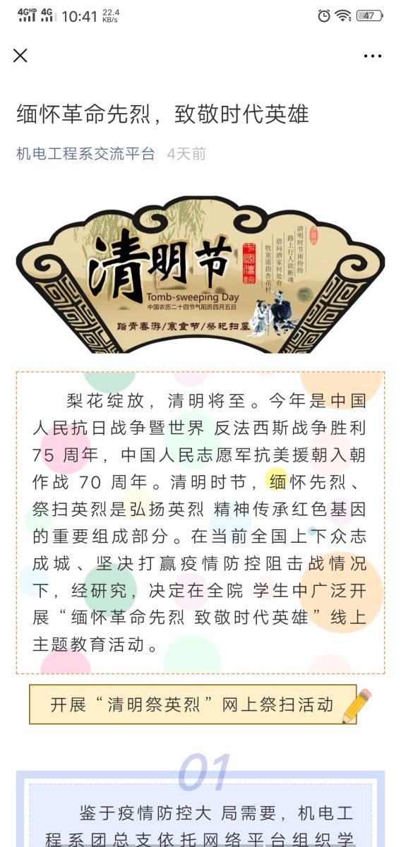 此次活动,院团委紧抓精神指导,做好顶层设计,发布清明节文明祭祀倡议书,引领广大学子积极参与,齐聚云端,通过进入中华英烈网或当地的相关网址进行网上祭扫,进行网上献花祭奠、留言等安全、健康、绿色的方式,表达对先烈的哀思;各系团总支通过新媒体平台发起了“慎终追远 云端寄思”话题活动、“英雄,我想对你说”征文活动,组织学生参与话题讨论,并用文字书写对革命先烈和时代英雄的缅怀精神;食品工程系团总支通过开展“致敬—英雄”主题手抄报活动,通过描绘英雄事迹,抒发澎湃激情,坚定理想信念,用书画致敬为抗击疫情牺牲的时代英雄。