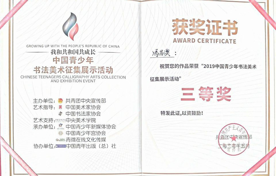 近期,2019年“我和共和国共成长”中国青少年书法美术展示活动在其网站公布了获奖作品名单。我院海洋生物与医药系冯昌澳同学的书法作品荣获三等奖。该作品从10万余幅作品中脱颖而出,最终以坚实的功底赢得评委的肯定。