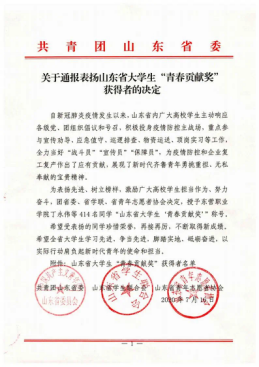 近日,由共青团山东省委、山东省学生联合会、山东省青年志愿者协会联合开展的山东省大学生“青春贡献奖”评选活动结果揭晓,我院食品工程系赵龙海同学凭借抗击疫情期间的突出表现光荣上榜。