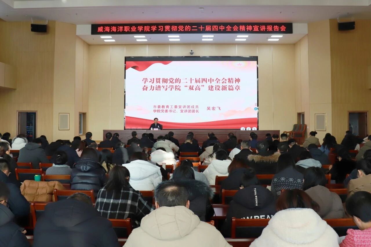 12月26日上午,威海海洋职业学院举办学习贯彻党的二十届四中全会精神宣讲报告会,市委教育工委宣讲团成员,学院党委书记、宣讲团团长吴宏飞作《学习贯彻党的二十届四中全会精神、奋力谱写学院“双高”建设新篇章》主题宣讲。学院领导班子全体成员,各处室(馆、中心)、系部负责人,全体党员参加报告会。