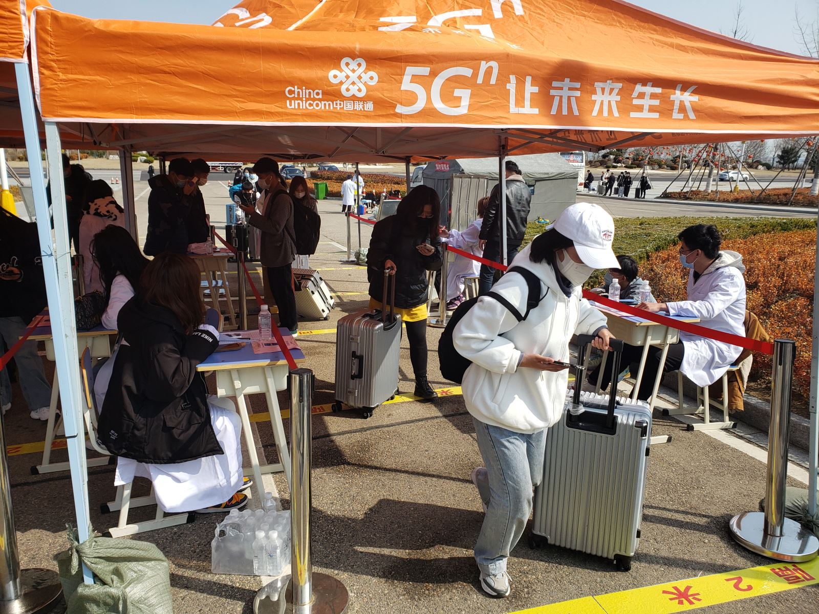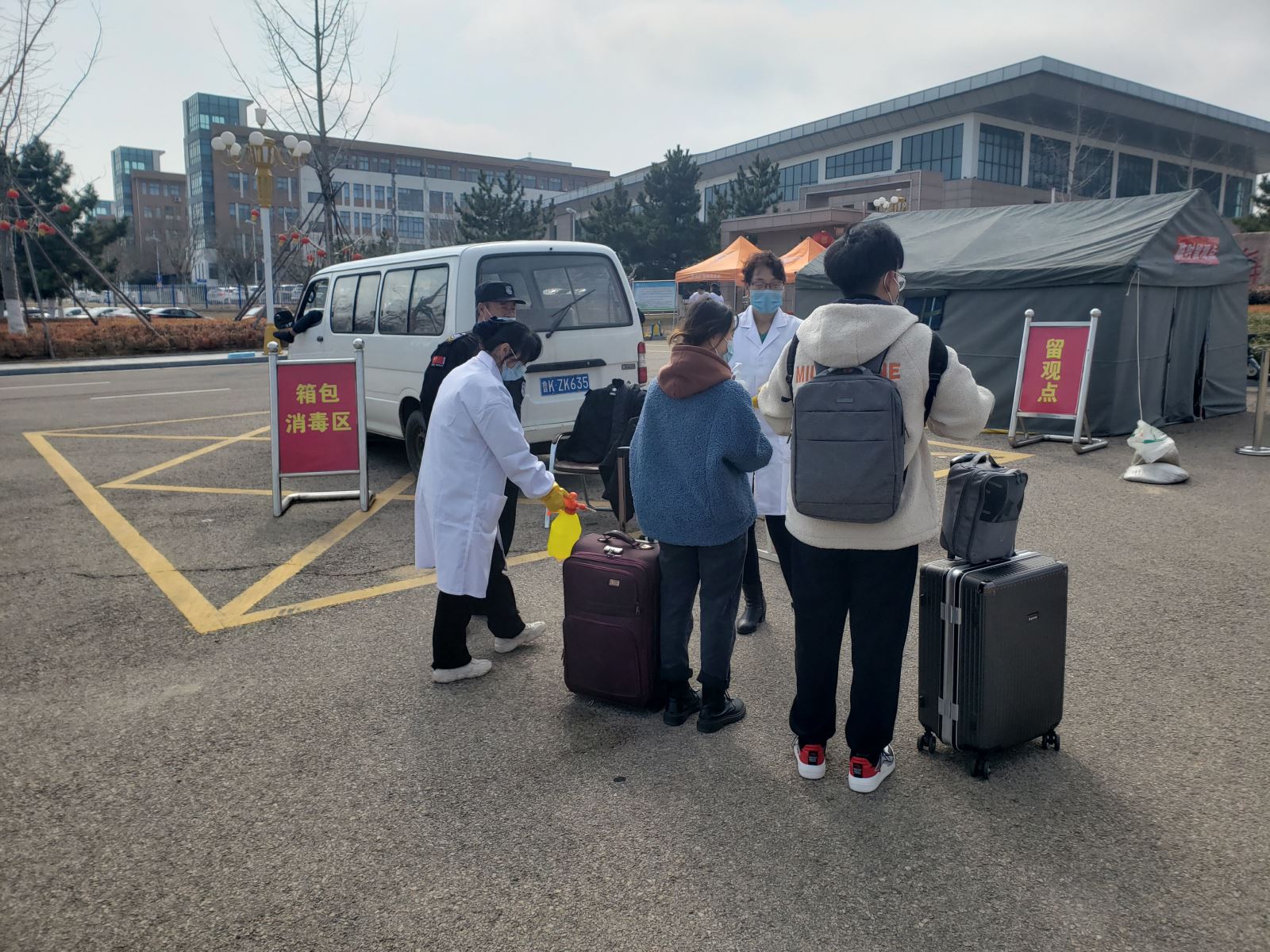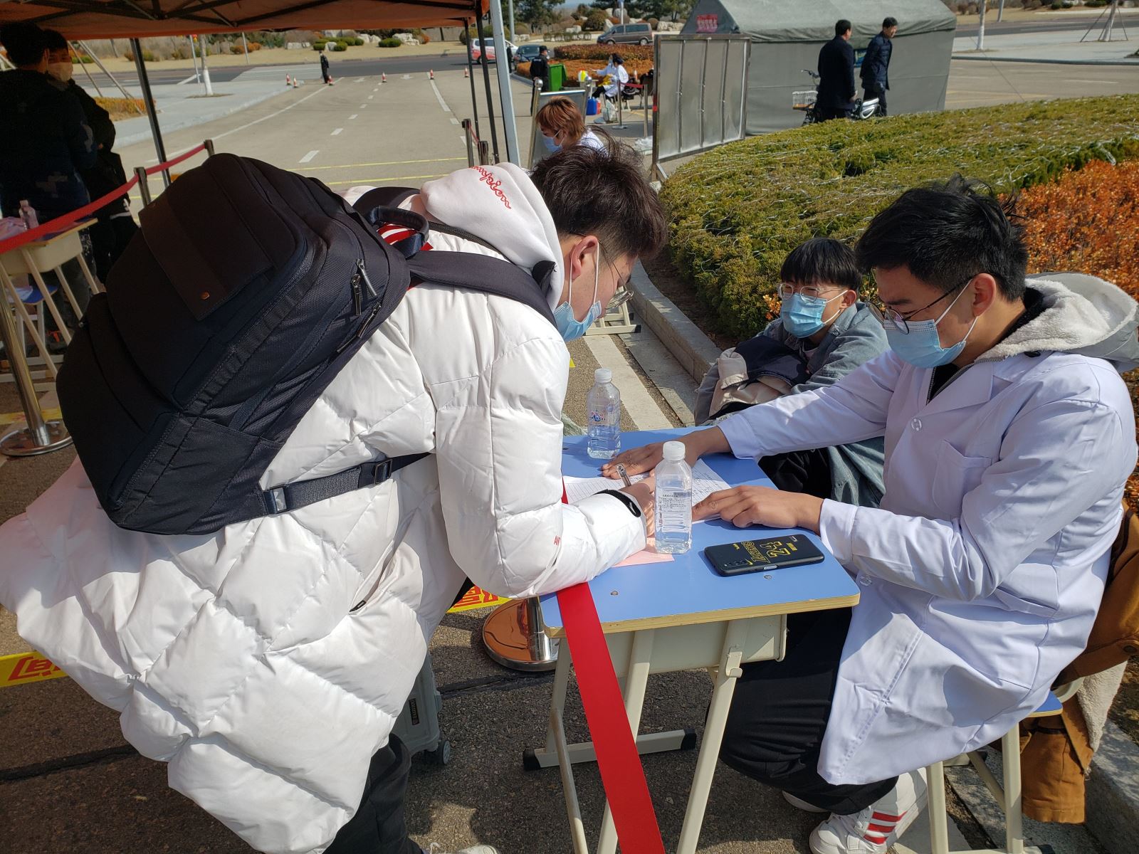 返校当天,在学院东门口,学生进校报到时,按要求在指定的通道接受查验,学校工作人员依次对学生的行李进行了消毒处理,体温检测,核查身份信息和“健康码”,并提醒告知有关注意事项,现场井然有序、规范严谨。与此同时,学院于荣成以及威海周边各大站点均设有志愿者接站服务点,统一安排接送车,将返校学生送达至学院东门口。
