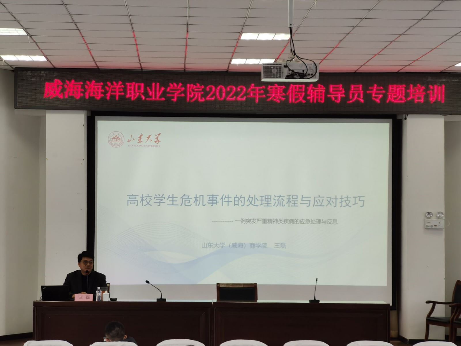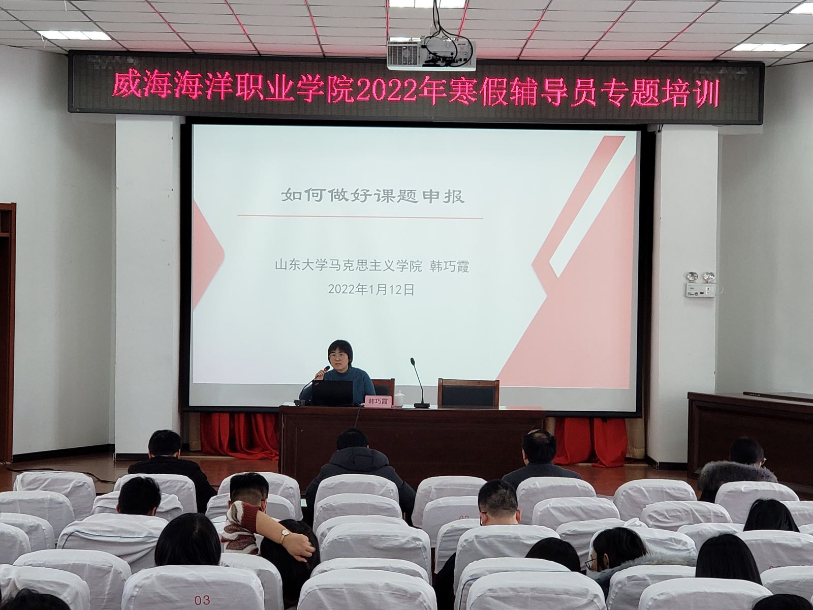 本次培训邀请山东大学(威海)的思政研究学者、优秀辅导员为全体辅导员开展专题讲座。山东大学(威海)马克思主义学院硕士生导师韩巧霞、山东大学(威海)商学院团委书记仪富强、山东大学(威海)学生思想政治辅导员王磊 分别做了题为《如何做好思政课题申报》《基层学院团务工作介绍》《高校学生危机事件的处理流程和应对技巧》的报告。几位老师从思政课题的撰写、辅导员职业能力提升、团务工作技巧、学生危机事件处置等角度出发,结合工作实际和个人体会,进行了深入浅出的讲解,内涵丰富,发人深思。