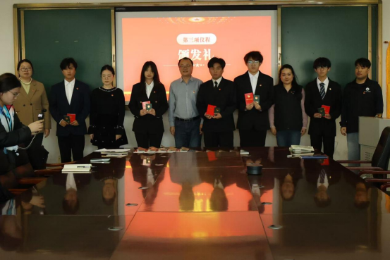 仪式在庄严的国歌声中开始,全体人员肃立致敬,激昂旋律激荡起浓厚的爱国情怀。随后,主持人宣读了新发展团员名单,现场响起热烈掌声,传递着对新团员的祝贺与期盼。系党总支副书记付宗魁与团干部一同为新团员佩戴团徽、颁发团员证和团章。熠熠生辉的团徽佩戴在胸前,标志着他们正式加入共青团组织,也意味着一份光荣的责任与使命。