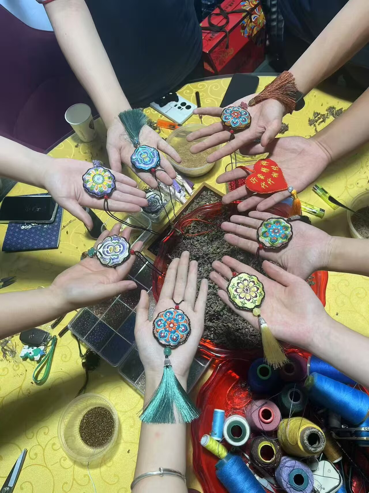 随后,在手绣老师的耐心指导下,志愿者们穿针引线,亲手制作非遗手绣香包,从图案设计到针法运用,近距离亲身感受传统手工艺的精妙。
