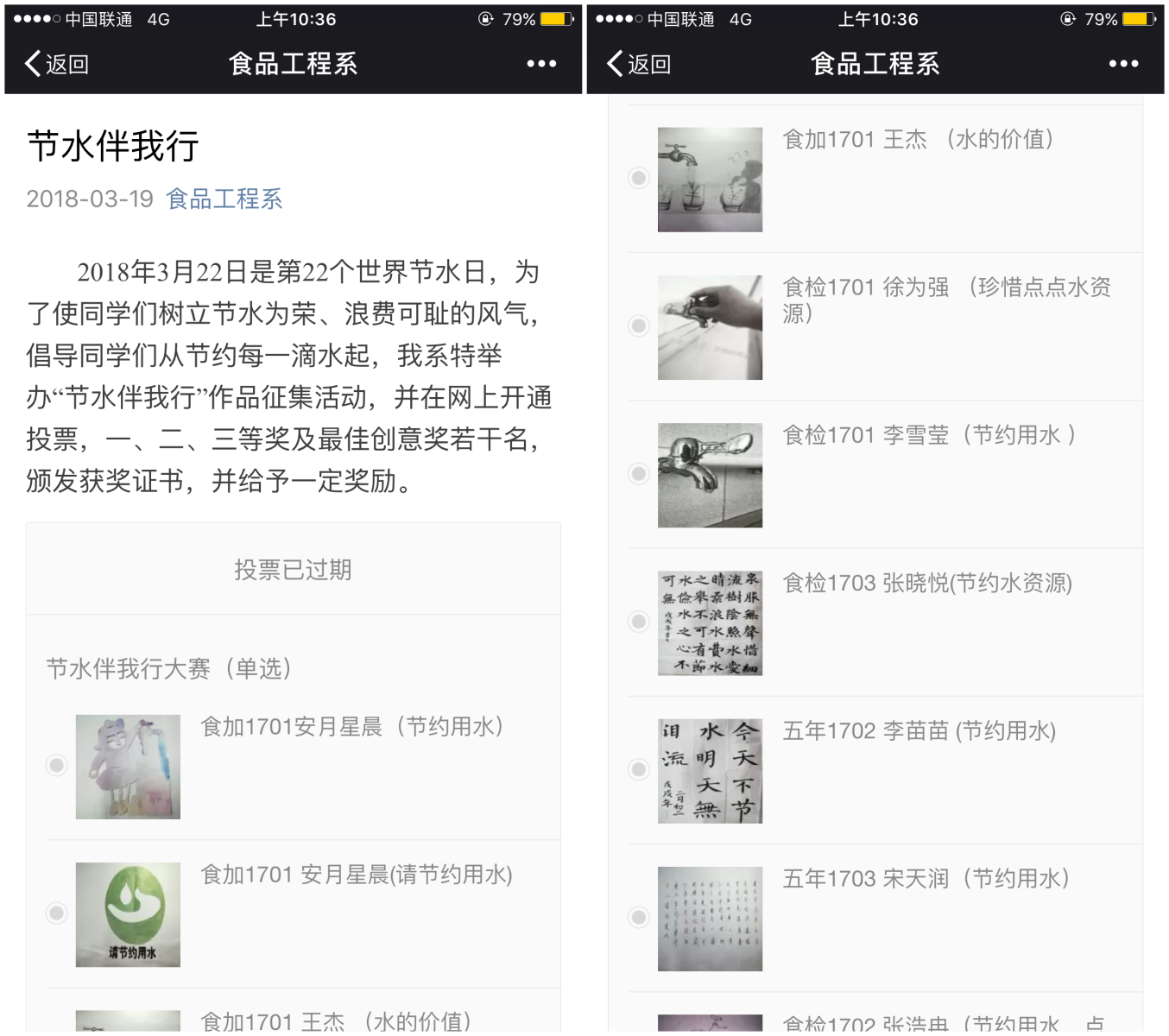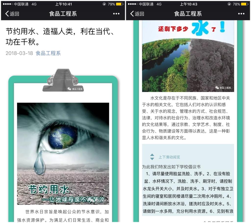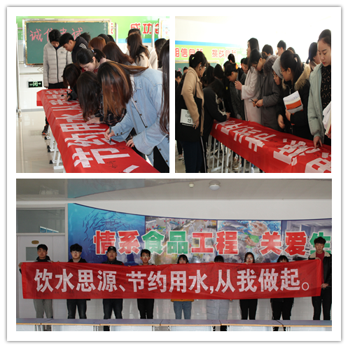 我系通过展板、微信公众号宣传等形式,向全校师生发出了“世界水日·中国水周”行动倡议书,呼吁大家成为“节水护水”的倡导者、践行者和捍卫者。3月21日上午10时在全系开展“饮水思源、节约用水、从我做起”签名活动,同学们了解到活动意义后,积极在横幅上签名许下承诺并表示会在生活中做到保护水资源,节约水资源,从我做起,从节约每一滴水做起,积极加入到节水、爱水、护水活动中去。