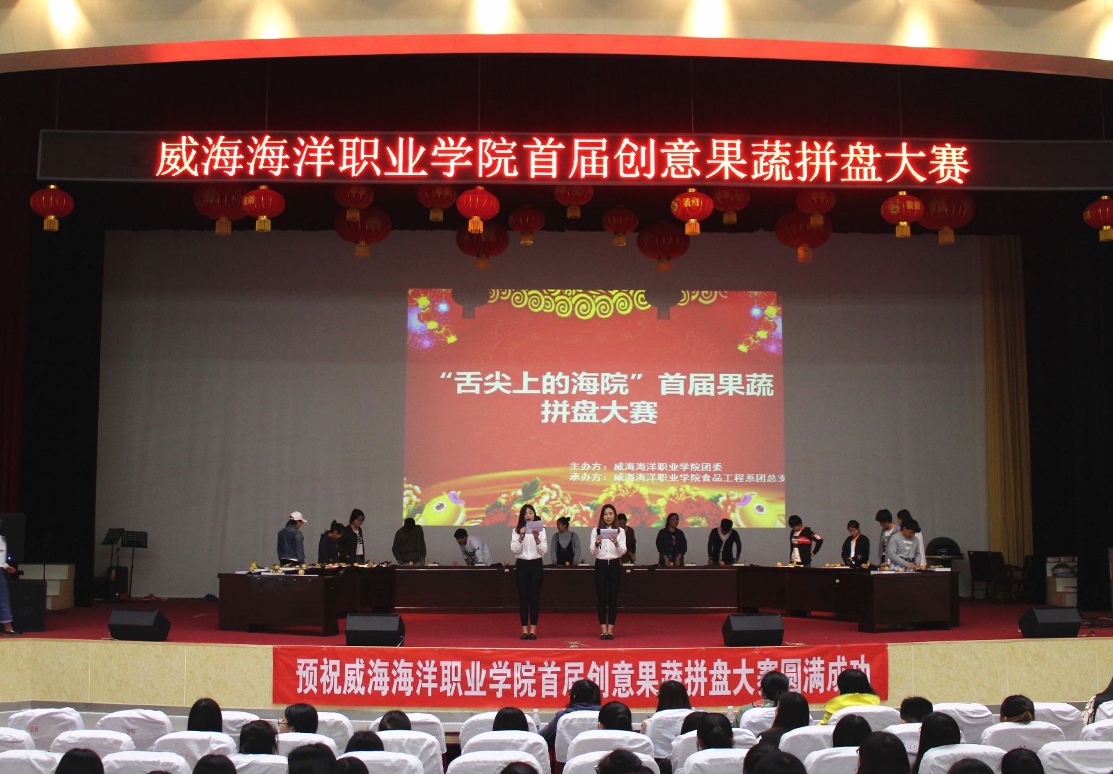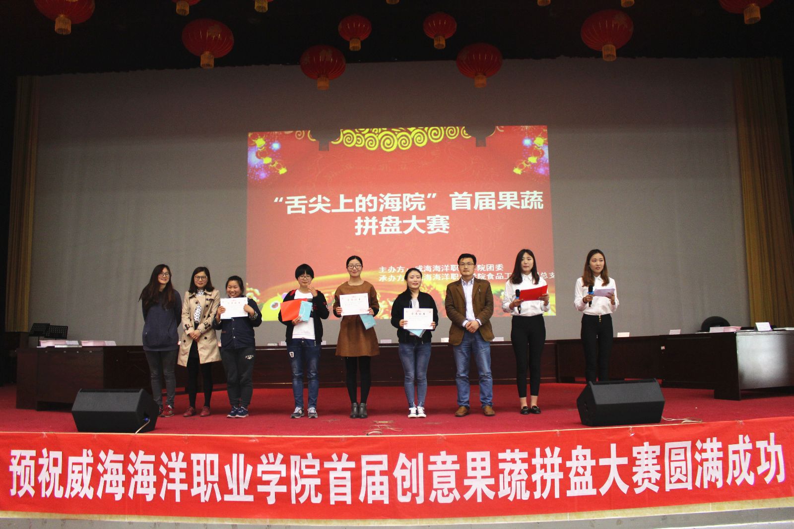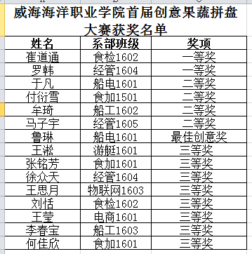 为进一步丰富大学生的校园文化生活,培养学生的动手创新能力和健康营养膳食理念,2017年4月26日下午2时,由食品工程系承办的威海海洋职业学院首届创意果蔬拼盘大赛在学术报告厅举行。