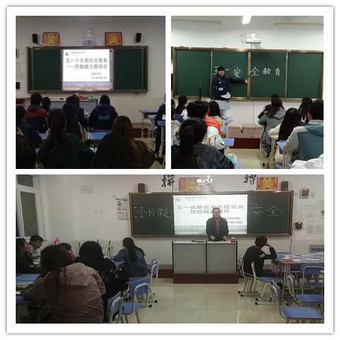 我系各班认真开展了假期安全教育主题班会,切实落实相关安全工作。各班首先强调了安全工作的重要性,着重从防火、防盗、防骗、防邪教、防传销、防交通意外事故、疾病防控、溺水预警教育等方面向同学们作了警示,尤其是提醒学生在五一出行高峰期要防践踏、避免踩踏事故的发生。要求学生们让每位同学把安全责任意识放在心中,确保假期安全稳定。及时和家长、班主任和导员联系并在假期后及时返校,严格履行请销假手续。最后,各班主任还深入宿舍,检查了宿舍安全隐患等情况,要求学生自觉维护宿舍环境卫生,杜绝火灾等安全隐患。