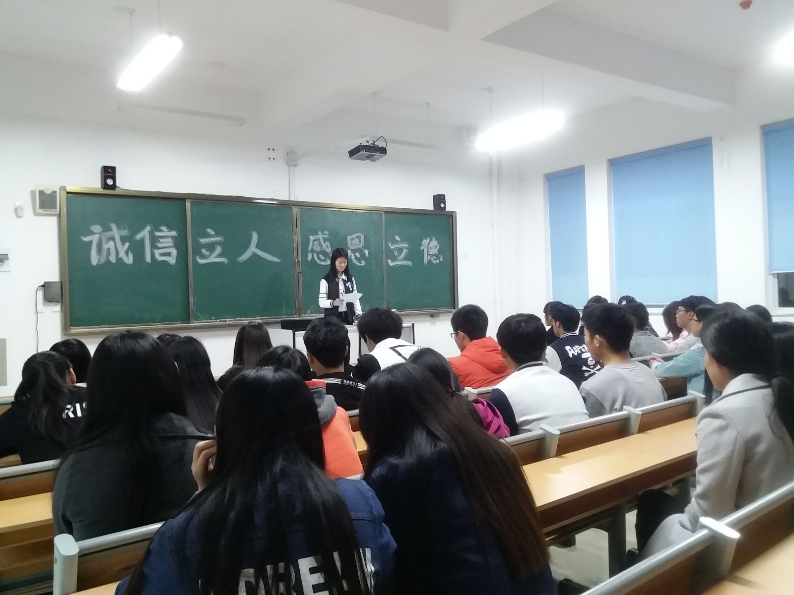 首先,认真带领大家学习了学院资助育人诚信教育的文件精神,通过学习让同学们认识到资助工作和诚信教育的重要性;同时带领大家学习国家最近的相关助学政策,让广大同学要树立诚信观念、增强法律意识。之后作为获得国家励志奖学金的优秀学生代表,14级02班的邓亚男同学以“感恩诚信、立志成材”主题做了精彩的励志演讲,她号召全体受资助学生应怀着感恩的心去回报父母、社会和国家,并加强自身学习建设,在心怀感恩的同时做到诚信做人、诚信考试。最后,希望全体受资助学生能够牢记社会与学校的恩情和帮助,正确合理使用国家、学院奖助学金和国家助学贷款,做到感恩祖国,诚信人生,努力学习,励志成才。