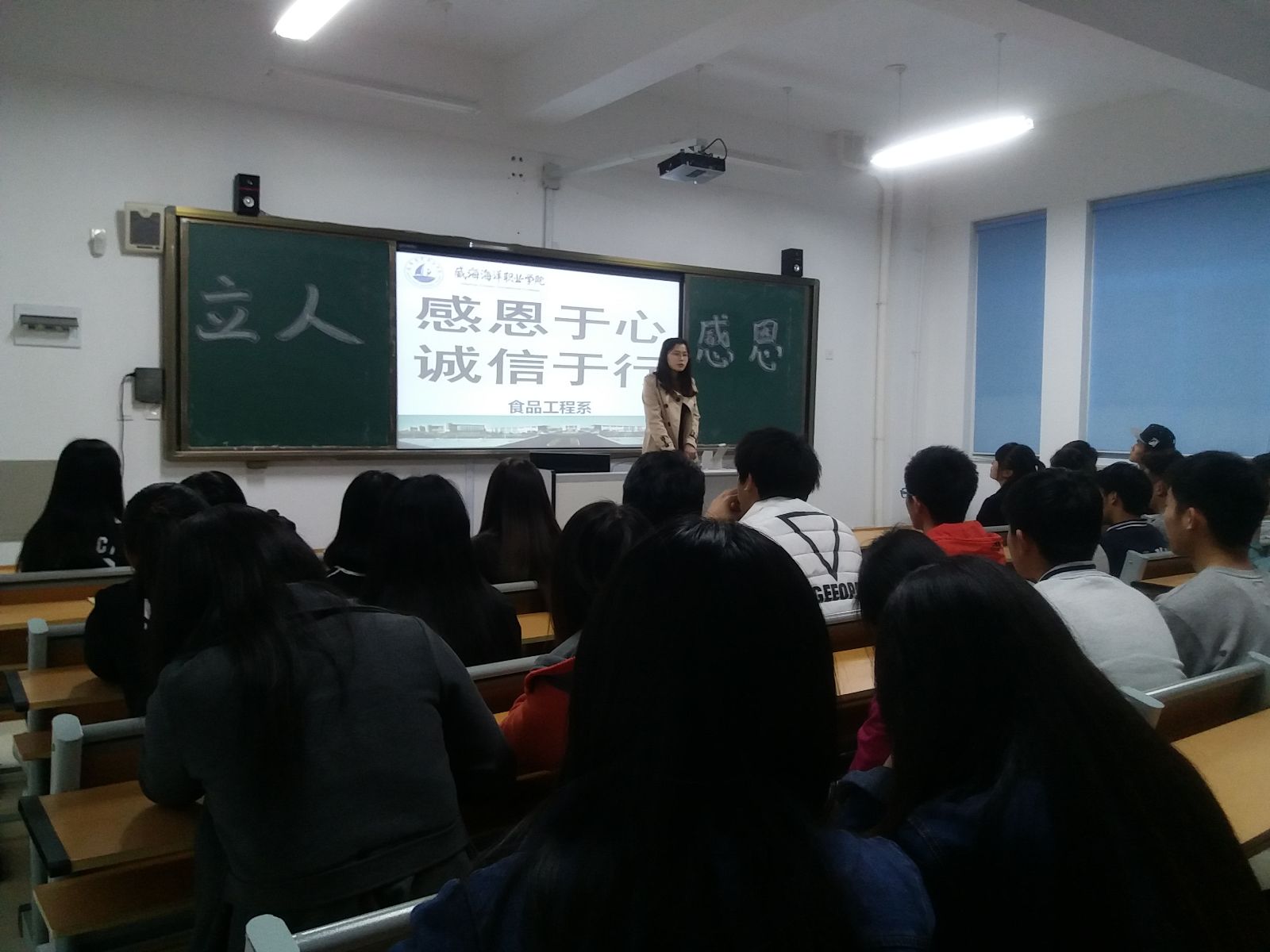为进一步弘扬社会主义核心价值观,构建大学生诚信感恩教育体系,把诚信感恩教育作为受助学生思想道德建设的切入点和突破点,为全面提高人才培养质量打下坚实的思想道德基础,根据威海海洋职业学院学生处《关于开展对受资助学生“感恩诚信教育”活动的通知》的相关要求,食品工程系于2016年4月14日晚在B1-409大教室召开了“感恩于心,诚信于行”教育大会。