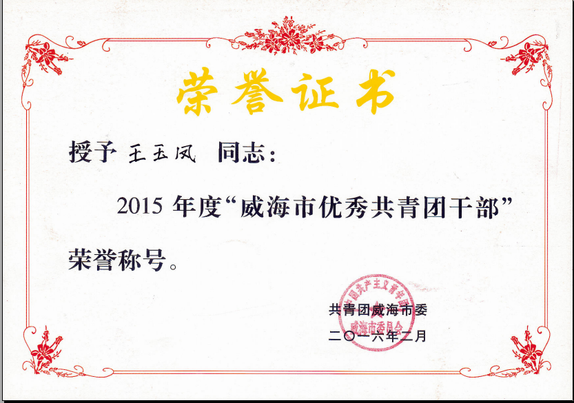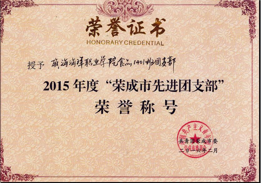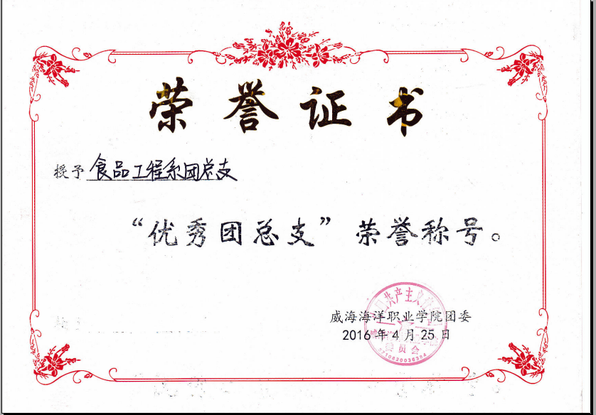 在2015年—2016年度食品工程系团总支工作表现突出,硕果连连。经过层层评选,食品1401团支部荣获2015年度“荣成市先进团支部”荣誉称号;王玉凤同志荣获2015年度“威海市优秀共青团干部”称号;食品工程系团总支荣获威海海洋职业学院2015年度“优秀团总支”荣誉称号;食品1403团支部荣获2015年度“威海海洋职业学院优秀团支部”荣誉称号;星夜编辑社和网络志愿队荣获“优秀社团”称号;孔凡帅同学荣获“优秀社团干部”荣誉称号;沈玉萍、周炳艳2同学被评选为“威海海洋职业学院2015年度优秀共青团干部”;闫纪刚等4名同学获“威海海洋职业学院2015年度优秀共青团员”荣誉称号。