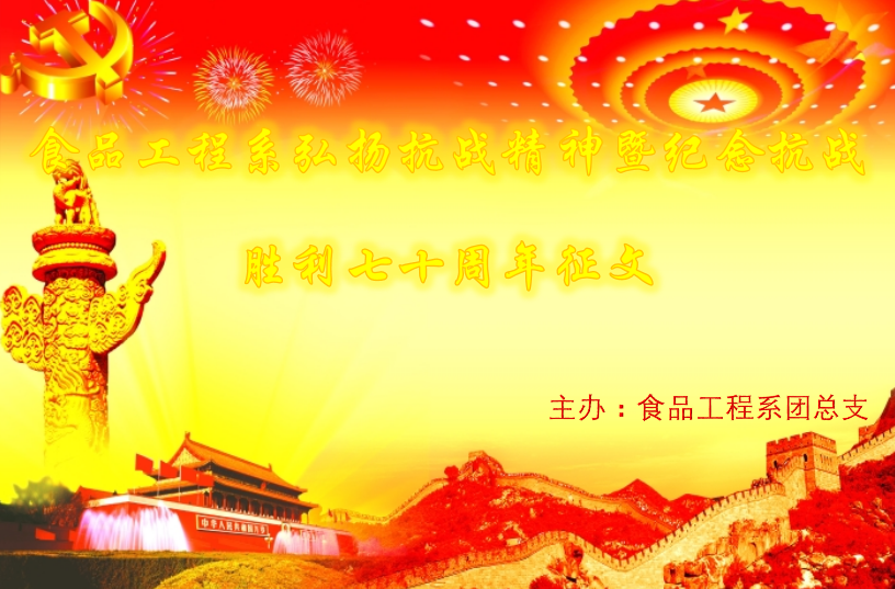7月1日起,食品工程系在全系开展了弘扬抗战精神暨纪念抗战胜利70周年征文活动。旨在宣传抗日战争胜利的重大意义,弘扬中国人民在抗日战争中所表现出的不怕牺牲、前赴后继、英勇战斗的爱国主义精神。同时,对广大学生进行重温历史、勿忘国耻、矢志振兴中华的爱国主义教育和民族精神教育,引导学生树立正确的世界观、人生观、价值观,不断增强民族自尊心、自信心和自豪感,增强当代大学生忧患意识及社会责任感和使命感,为实现中华民族伟大复兴的中国梦而努力奋斗。