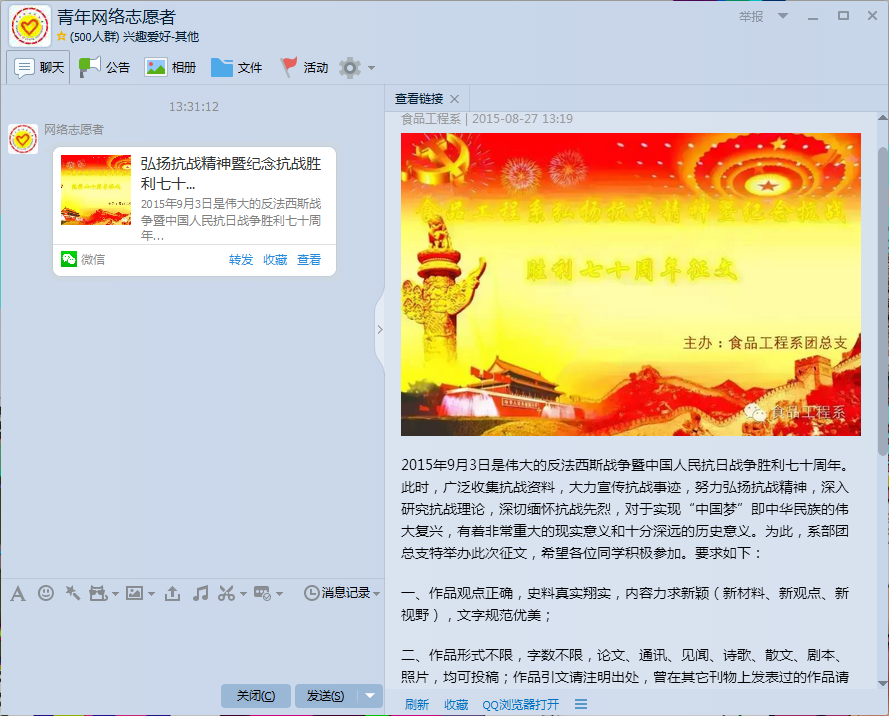 2015年是中国人民抗日战争暨世界反法西斯战争胜利70周年,为积极培育和践行社会主义核心价值观,大力弘扬伟大的抗战精神,推进爱国主义教育和民族精神培养,倡导学生把爱国主义与社会主义有机结合起来,把民族精神与当代大学生使命有机结合起来,把个人成长与社会责任有机结合起来,把万钧精神与爱校如家结合起来,食品工程系围绕“勿忘国耻,圆梦中华”的主题开展多项纪念活动,将思想育人、文化育人、融入到丰富多彩的校园文化活动中来。