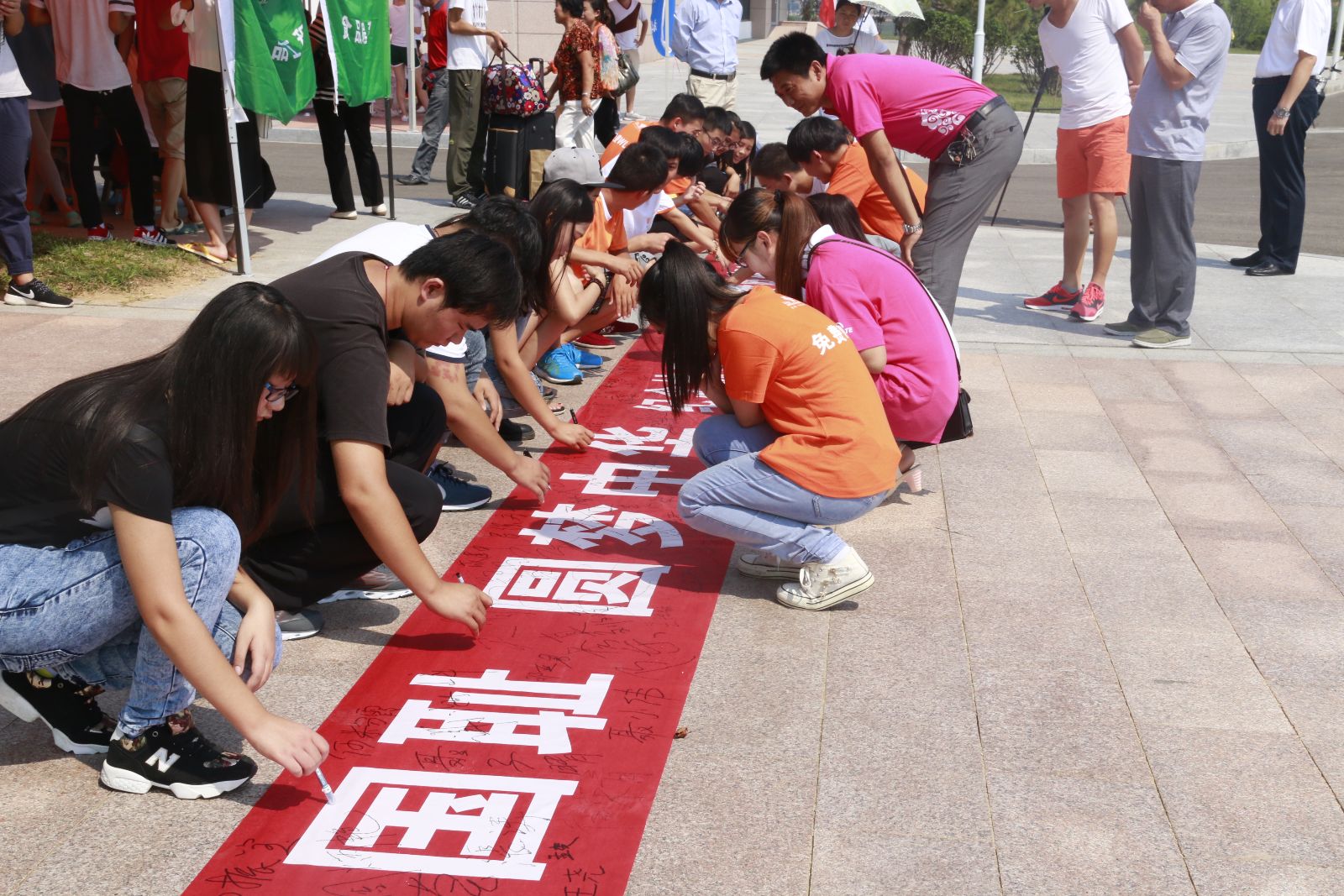8月29日,正值威海海洋职业学院新生报到之日,食品工程系组织系部领导、辅导员老师以及学生干部和2015级新生举行了纪念中国人民抗日战争胜利暨世界反法西斯战争胜利70周年签名宣誓表决心活动,大家纷纷在一面印有“勿忘国耻,圆梦中华”主题字样的条幅上郑重签名,深刻表达着对党忠诚的无比坚定和高尚的爱国情怀,大家一致表示,要以时不我待的紧迫意识,以舍我其谁的担当精神,努力学习,攻坚克难,谋发展、研创新、以实际行动践行当代大学生的民族责任和历史使命。
