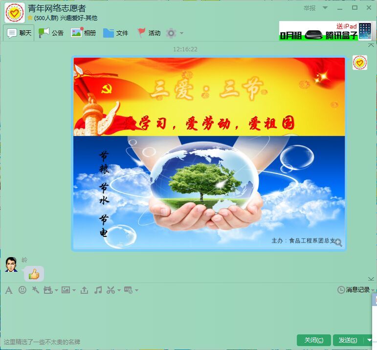 自8月31日起,食品工程系相继以班级为单位,结合本班实际,开展了形式、内容丰富多样的主题班会,并充分利用微信、微博、QQ等途径加大日常宣传力度,让“三爱三节”教育随处可见,随时可学,让学生在日常学习生活中通过实际行动来体现爱祖国、爱劳动、爱学习,同时树立勤俭节约的意识,自觉肩负起“厉行节约、反对浪费”的社会责任。